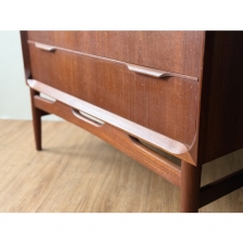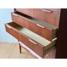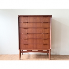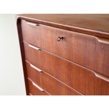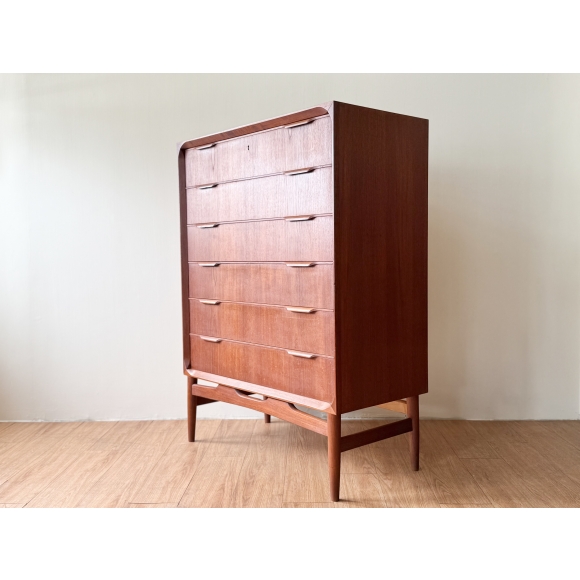 Danish Modern Teak Chest of Drawers 這款丹麥柚木斗櫃飾有圓角斜面鑲邊,六個抽屜採用榫接結構配有精美的木質把手,原廠鑰匙可鎖上頂層抽屜。抽屜滑動順暢,充分體現了其卓越的品質和經久耐用的設計,是理想的收納選擇,適用於臥室、客廳或辦公室。其優雅造型和簡約的設計,使其既能完美融入現代風格的室內設計,也能成為復古空間中的點睛之筆。 W85 、D43.5、H116 cm