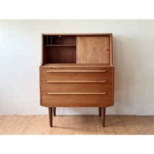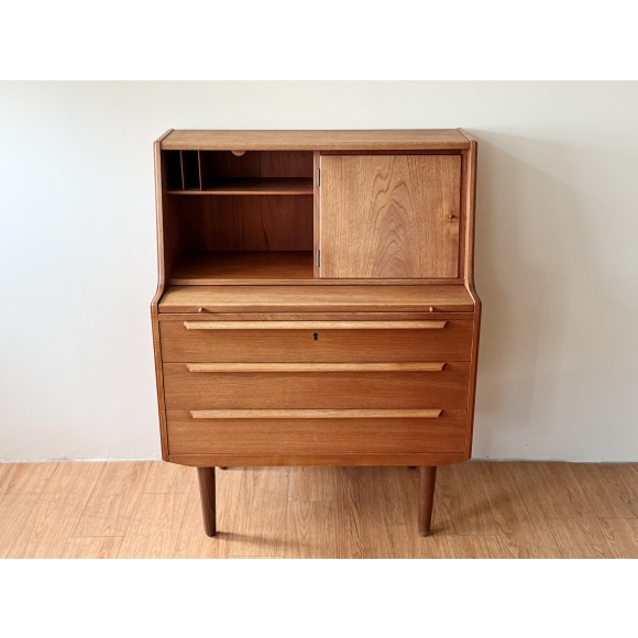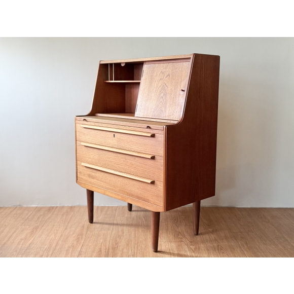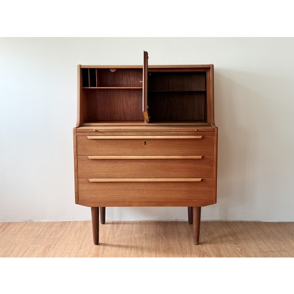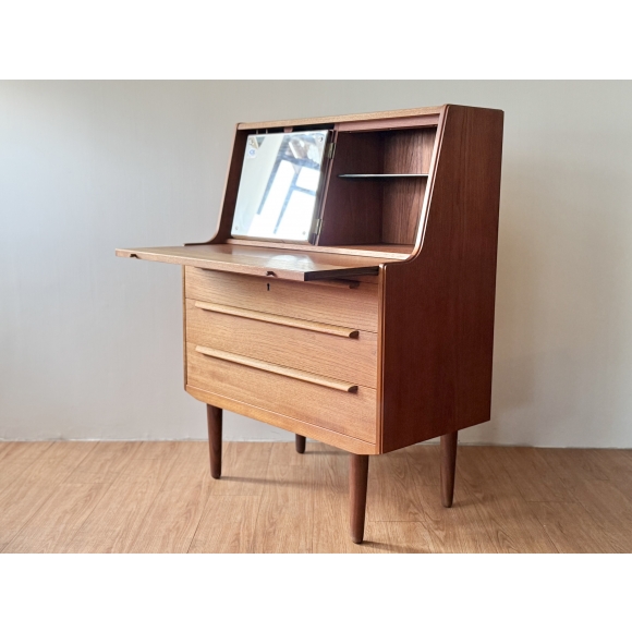 Danish teak bureau by Ølholm Møbelfabrik 這款優雅多功能的丹麥寫字桌和梳妝台,1960 年代由 Ølholm Møbelfabrik 製造。 梳妝鏡安裝在小櫃門的背面,黑色玻璃隔板巧妙地分隔了上下儲物空間,配有小圓錐形把手的桌板拉出後即可變成一張小書桌,非常適合寫作、使用筆記型電腦或整理文件。鏡櫃旁的層架空間提供存放個人物品、化妝品或文具,完美融合了優雅與實用性。 W84 x D44 x H109 cm