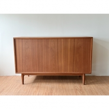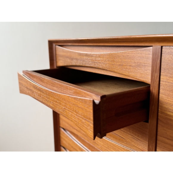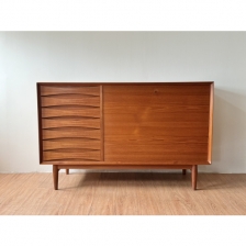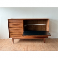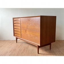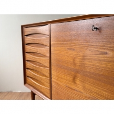 Arne Vodder Sideboard for Sibast 這款精緻的柚木櫥櫃或餐邊櫃由 Arne Vodder 於 60年代為丹麥家具製造商 Sibast 設計。 小巧的櫃體左側設有 7 個抽屜,飾有大師標誌性的葉形雕刻門把,獨樹一格,右側為下拉式櫃門,功能齊全,收納空間充足。 背部採用美背設計達到整體美觀,因此也可以遠離牆壁使用。 W126 x D49.5 x H80.5 cm