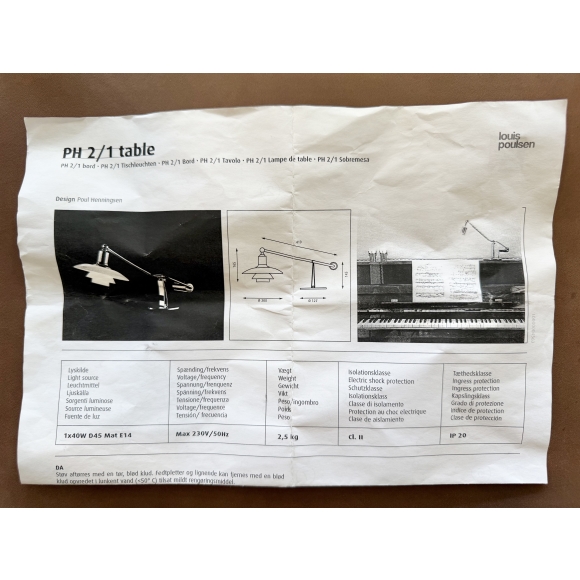 鋼琴燈 由 Poul Henningsen 於 1943 年 設計,其特點是帶有特殊彎曲燈桿與底座,專為照亮鋼琴琴譜而生。燈罩採用白色乳白玻璃, 框架採用鍍鉻金屬。然而此經典作品已停止生產。